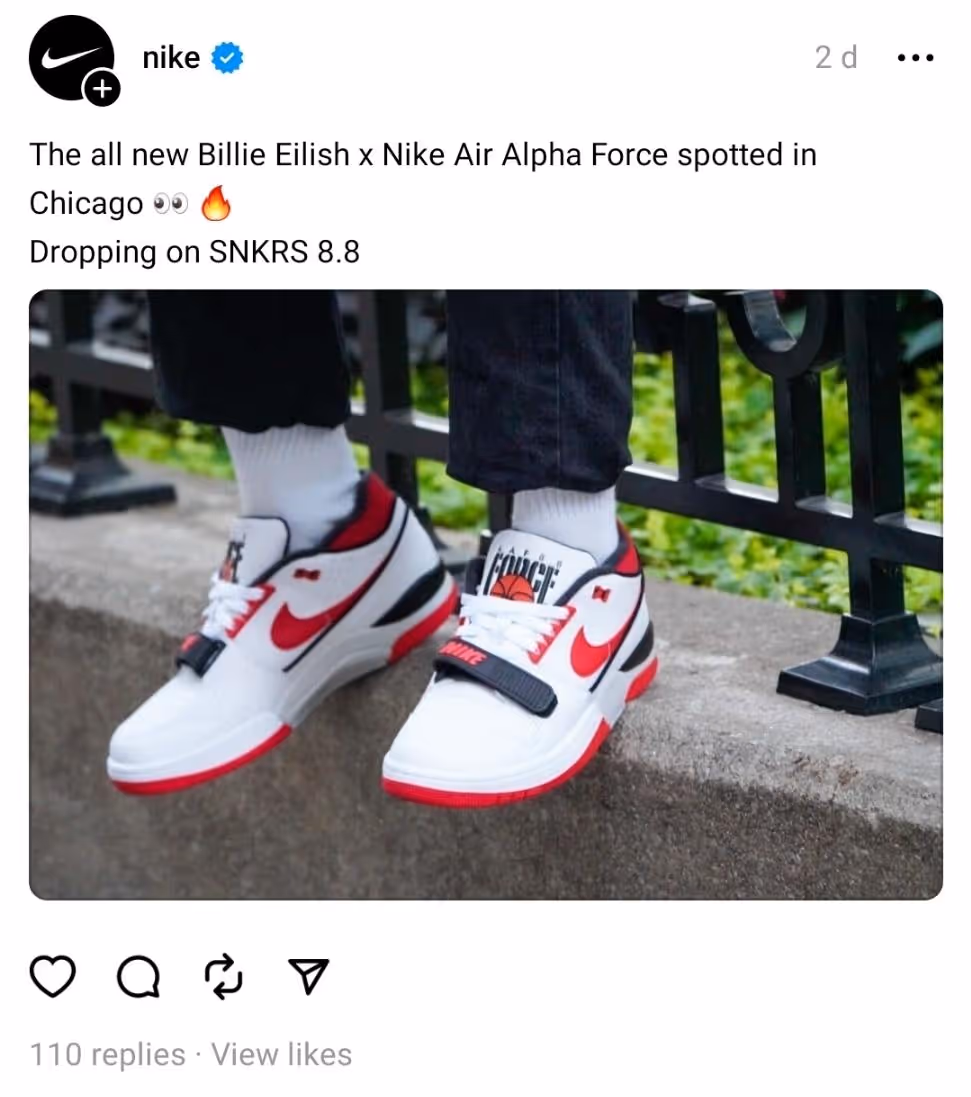Here’s an example from Nike. They’re releasing new kicks on 8.8. Plus, it helps that it was a celebrity collaboration, so it’s much easier for them to connect with their audience, especially fans of the celebrity.