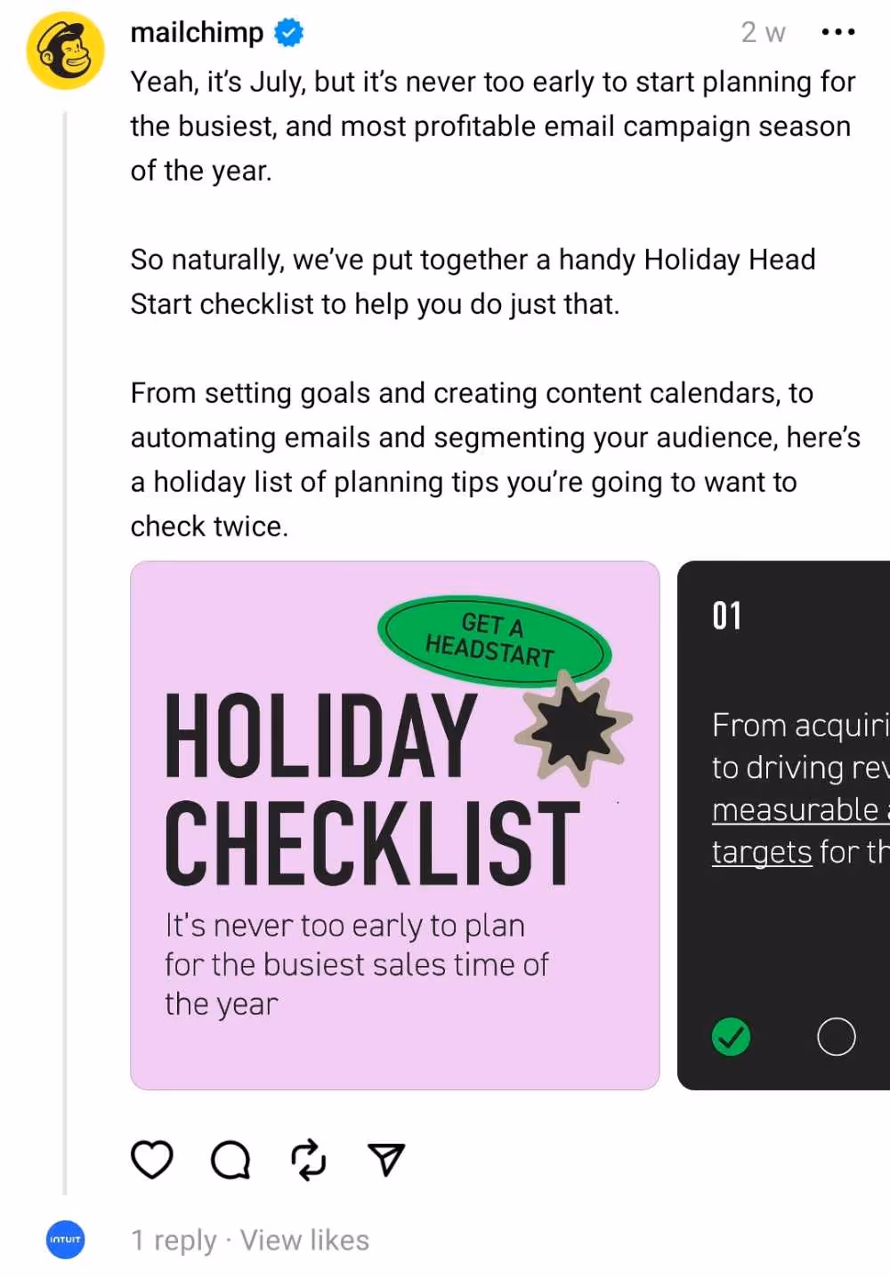 Check out this example from Mailchimp. Instead of using the 500-character limit on Threads, you can post images to show a process. Mailchimp created a checklist to help remind its followers of the best practices during the holidays.