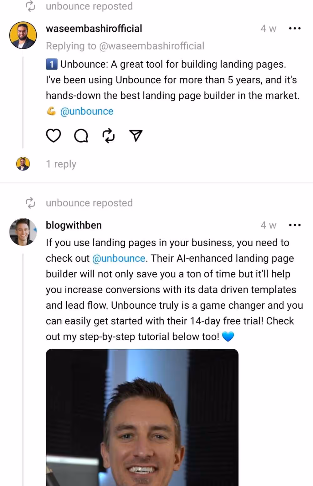 An example of a review repost comes from Unbounce. Although they have two so far, it will help new users know how Unbounce has helped current users.