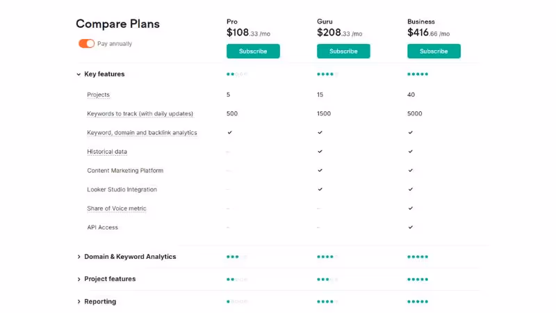 On the other hand, Semrush offers tiered plans starting from $108.33 for annual billing, with an additional enterprise plan based on specific needs.