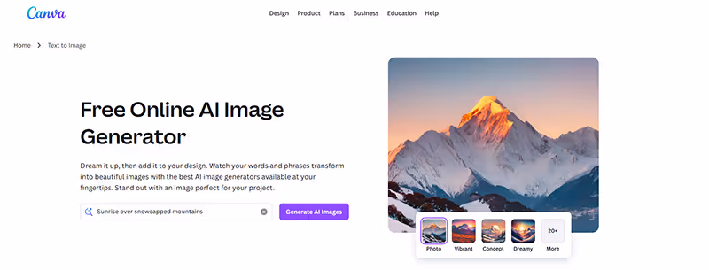 Canva AI Image Generator Powered by Magic Media™ suite and Dream Lab, Canva AI Image Generator is a go-to design solution for many entrepreneurs and marketers. It has become a favorite, thanks to its ability to craft fast and stylish visuals without a high learning curve. With just your simple text prompts, you'll get polished graphics, illustrations, and short videos in an instant.