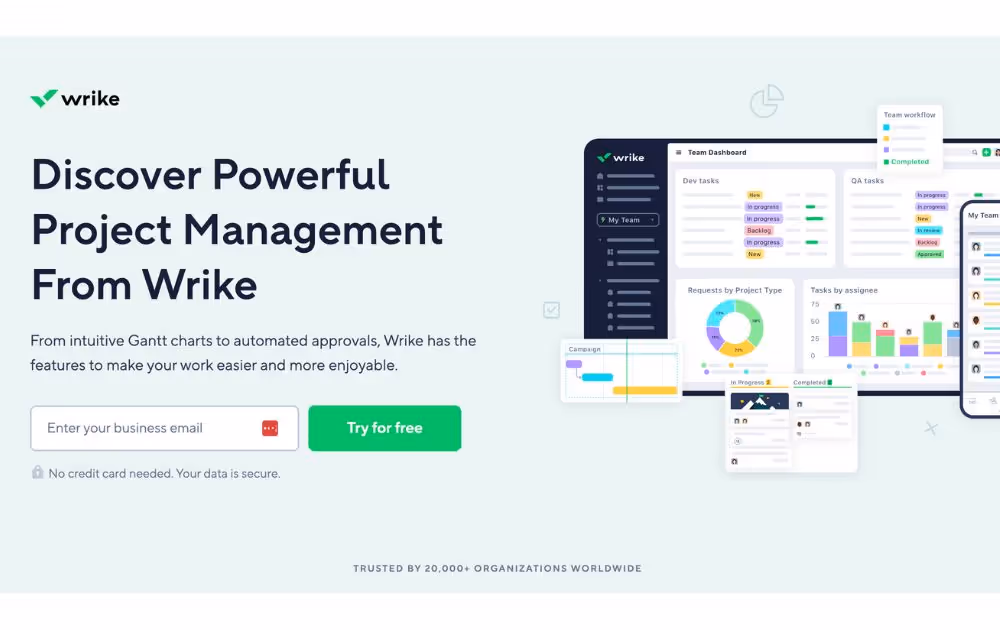 Want to manage projects and teams in one place? Wrike is the place to be. It is best for aligning teams on deadlines and events. It also has customizable calendars and dashboards, Gantt charts, and Kanban boards to help companies gain more control over their workload.