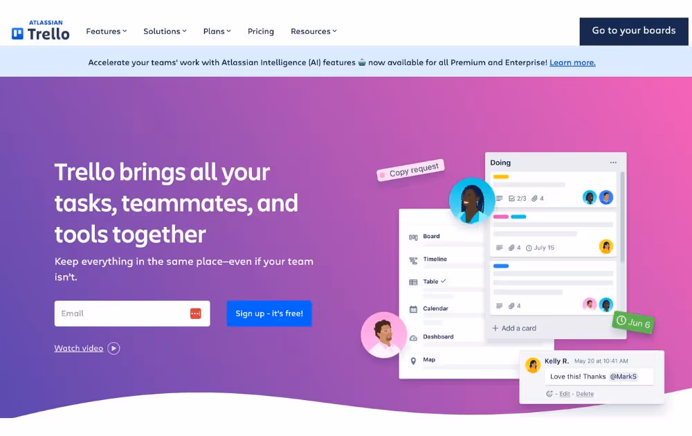 First, Trello is one of the most well-known ClickUp alternatives. This management tool is best for teams that want to visualize tasks using Kanban boards. Apart from that, you can also create lists to see the different stages of tasks.