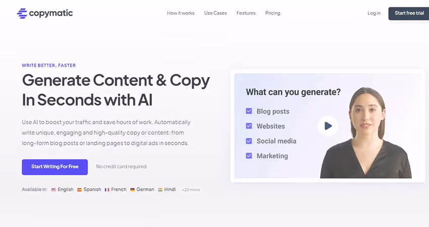 - Create High-Converting Copies - Copymatic creates ready-to-convert pages, sales pages, emails, ads & video scripts across any niche from one dashboard.