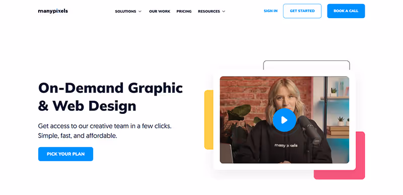 Pricing: Pricing comes in a variety of plans which is as follows: Fast Track: $249 Standard: $399 Executive: $699 Premium: $999 There are also the One to One Projects that you set your price with. Their Logo Maker is priced as follows: Basic: $20 Premium: $65 Enterprise: $125 Pros: They have a free design consultation to help you get the exact design you need. They have a money-back guarantee when the design contests produce results that are not to your liking. It lets you create polls to ask opinions about the contest results to help you decide. Cons: Too many prospects will try and get your attention which can be overwhelming. No assurance of designer reliability and quality. 7. ManyPixels With the same offer of providing unlimited graphic design service, ManyPixels is more similar to Design Pickle. Like Penji, they provide unlimited design and revisions for a fixed monthly rate. This means that you’ll get to request as many design projects as you need as well as revisions.