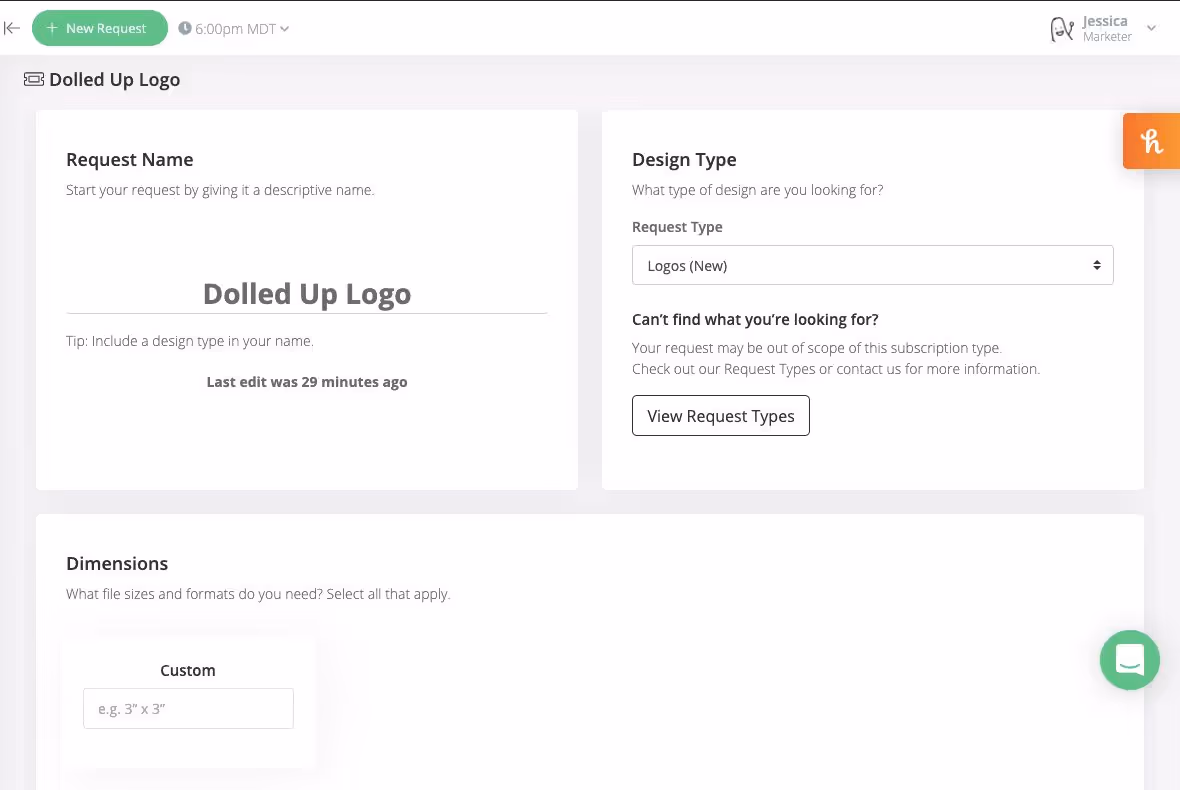 Design Pickle asks you to fill out a form on their dashboard to request designs. I was asked to give the request a name, which I called “Dolled Up Logo.” The form asked for basic information that any designer would ask for designs such as type of design, dimensions, preferred file format, etc.
