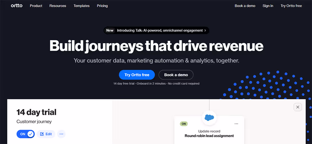 Previously known as Autopilot, Ortto is a one-stop shop for all your email marketing automation needs. Its notable features include Journeys, Talk, and Ortto AI. These let you create personalized emails that resonate with your target audience. It leverages the power of AI to optimize your messages and live chats to enhance your emails' open and read rates.
