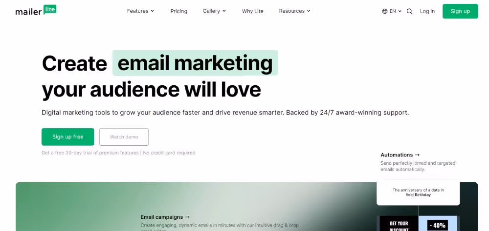 Most email marketing platforms have their own drag-and-drop editors and email automation tools. You can also get leads from landing pages and forms to streamline your workflow in one place! Plus, you can integrate other marketing strategies into your email marketing one like SMS! Finally, you can integrate tools like Shopify and Squarespace.