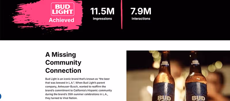 Viral Nation’s Successful Campaign: Bud Light #HechoEnCalifornia Viral Nation developed and led an influencer campaign to help the brand Bud Light capture the highly targeted Hispanic audience. The campaign utilized the influence of content creators in California who shared their love of Bud Light through Instagram Stories. This influencer marketing campaign for Bud Light drove awareness and brand loyalty while surpassing our goals by 250%.