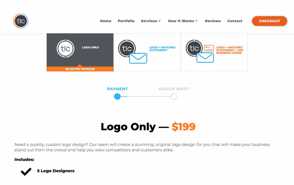 You can’t always get it right the first time. Their logo package starts at $199, with unlimited redraws and unlimited revisions. They also have other add-on extras like a branding guidelines document for $80.