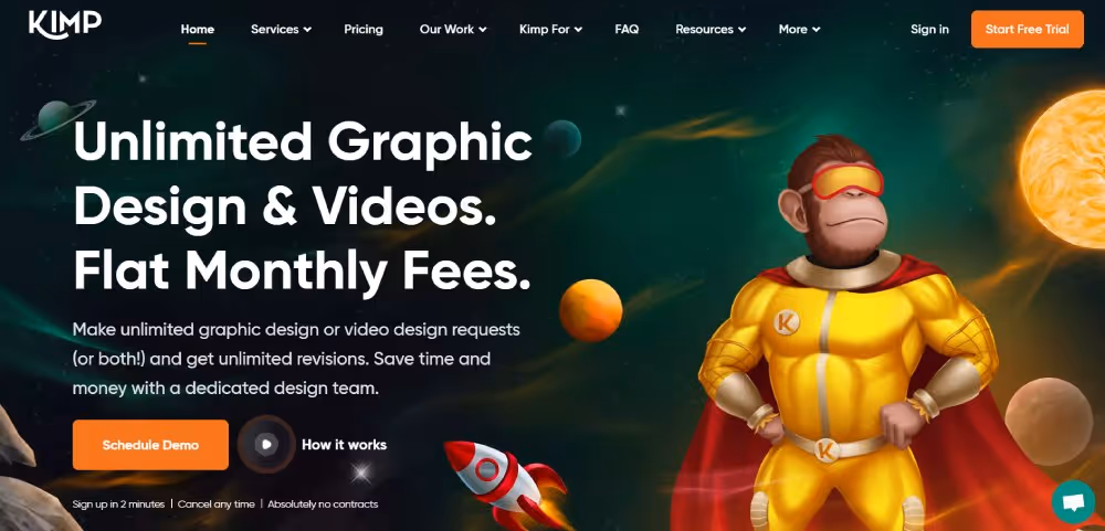 The last on our list is Kimp. Like Penji, Kimp is an unlimited graphic design service. The unlimited design service also creates logos for any industry. Similar to Penji, it’s ideal for businesses with a high demand for design. Plus, they offer video services, too, if you need them for your brand. Furthermore, agencies, entrepreneurs, health and fitness brands, and professional services are the ideal target audience for Kimp.
