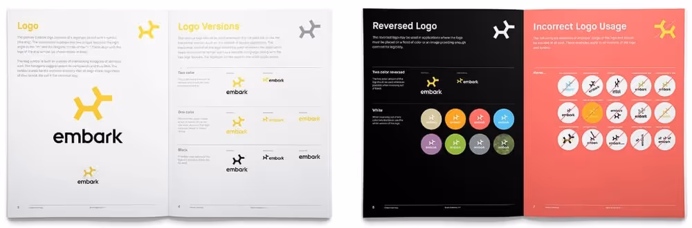 Here’s one unique and modern logo. Embark is a tech company selling DNA test kits. It’s not for humans, but for their furry pets. Meta Design handled the branding for the tech company. It’s a pictorial mark of a stick figure dog. But the sticks represent DNA and science. In addition, the agency gives us a sneak peek of their client’s brand style guide showing how you can make a logo versatile.