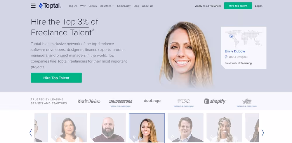 Toptal is another leading choice for small businesses to get logo designs. The freelance platform prides itself in vetting the top 3% of freelancers worldwide. In addition, they have a rigorous vetting process to ensure only the best of the best are part of their exclusive platform.