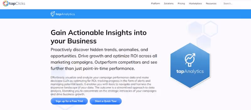 10. TapClicks TapClicks is a business intelligence (BI) and analytics platform focused on digital marketing reporting for agencies and media companies. It has all the features seen in a BI tool, like automated reporting, custom reporting widgets, and integrations with thousands of data sources.