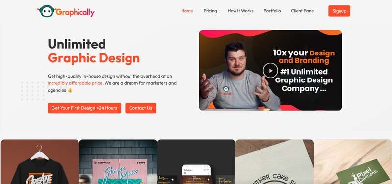 Overkill for solo founders needing basic social graphics. Premium pricing compared to entry-level alternatives. 9. Graphically Graphically's unlimited design services cover both graphic and video design. Their talented designers create great display ads, social media graphics, favicons, basic animated GIFs, and product package design. Graphically has worked with global clients, including FatRank and the SEO Institute.
