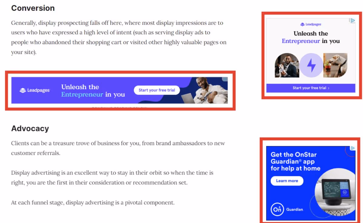 - Display ads: Ads on the websites that may appear on headers, sidebars, or within the copy.