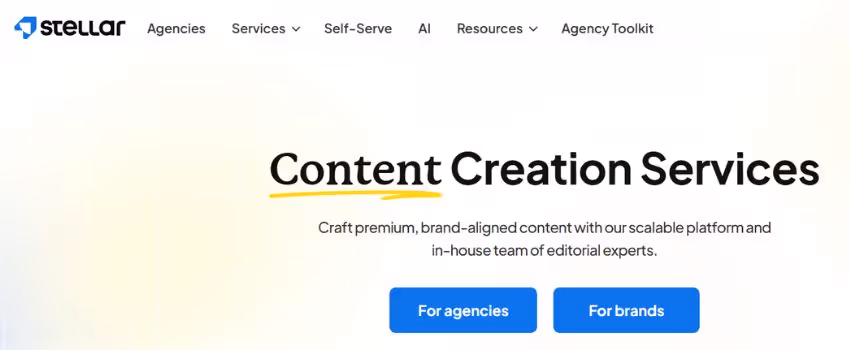 9. Stellar (formerly Crowd Content) Screenshot from the Stellar website While typically handling strategic marketing, Stellar agency has a content writing service that can provide professional copywriting and takes the heavy lifting of in-house content creation.