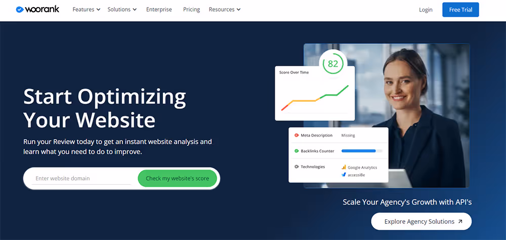 SEO Analysis and Website Review by Woorank has a user-friendly interface and advanced features suitable for users with varying levels of SEO skills. Pricing starts at $19.99 per month.