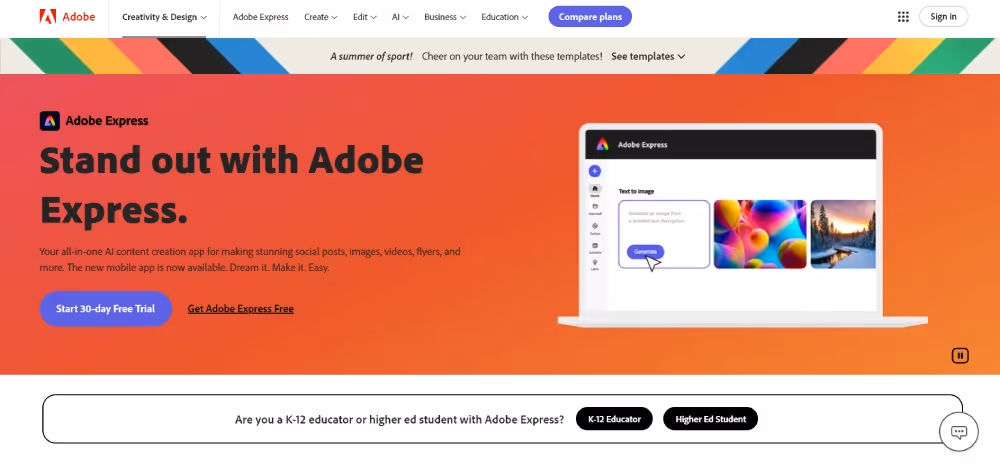 An alternative to Canva is Adobe Express. This tool lets you create designs from scratch or using templates. It also has a drag-and-drop editor to customize your work. Plus, there are quick tools like background remover and image resize.