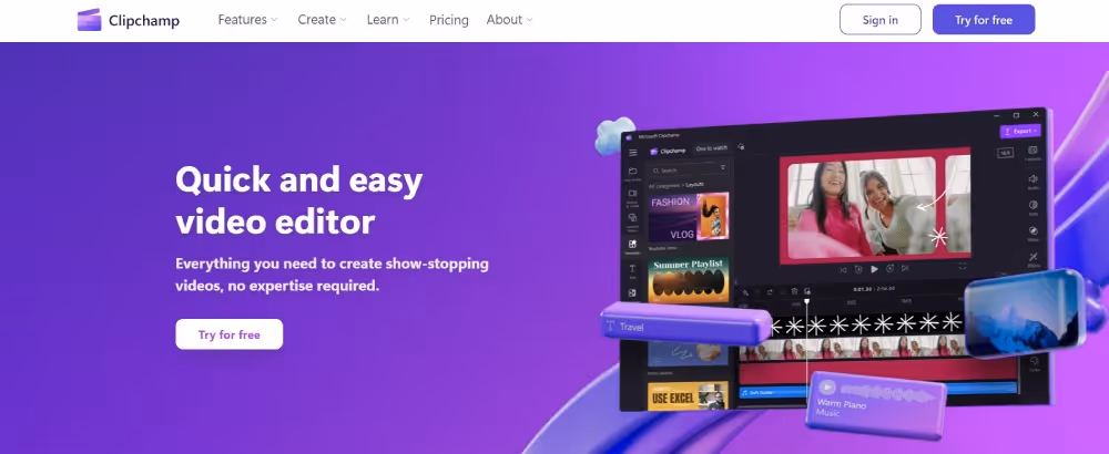 ClipChamp is one of the top video editing tools ideal for beginners and marketers. It allows you to import, trim, crop, add animations and transitions, and save videos in 1080p. Like graphic design tools, it also has templates and search video clips to add to your engaging video!