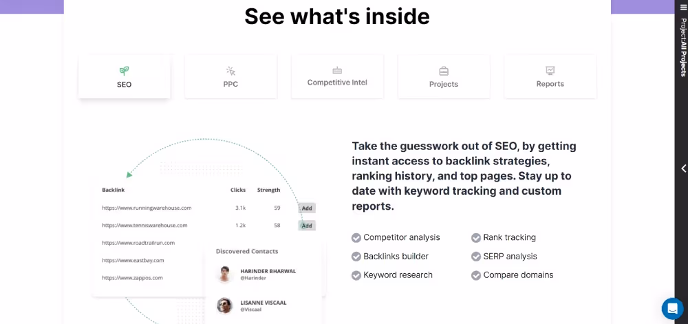 If you’re running a Google ad campaign, SpyFu can be your partner for everything PPC. You get access to the Google Ads Advisor and templates. Plus, you get ad history and compare domains! If you want to spy on your competitors, know which keywords they’re buying and know the results of their split testing! Finally, get negative match recommendations and track ranking!