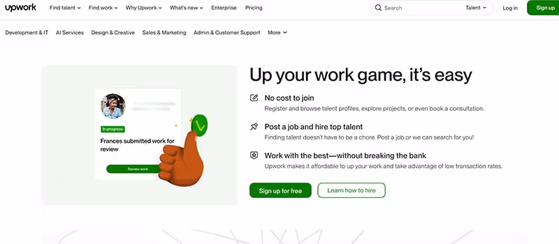 2. Upwork Upwork is a popular website where freelancers and clients worldwide converge. The platform offers diverse services, including software development, web design, accounting, and customer service. There are various ways to connect. Clients can post a job, hire talent, or buy a service from the project catalog. Likewise, freelancers can access the job board and offer a service to sell.