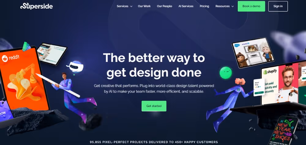 Superside is another graphic design company to check out, especially when you need more than just graphic design in one month. It follows a creative-as-a-service model where you can get designs and videos in one place. Plus, you can also get consultations from their experts. The company offers design, print, branding, social media, marketing, AR/3D, and AI-enhanced designs. With Superside, you get 12-hour turnaround times and get credits to request designs or videos.